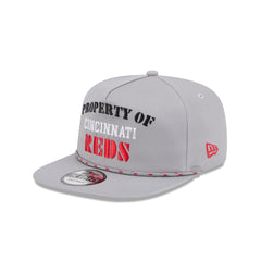 The Cincinnati Reds Vintage Gray Golfer features an embroidered 'PROPERTY OF' Reds wordmark at the front panels with a team logo at the right-wear side and a rope at the visor. Additional details include a snapback closure at the rear and a green undervisor.