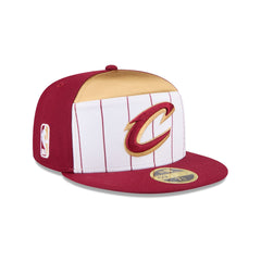 The Cleveland Cavaliers 2025 Tip-Off Split Panel 59FIFTY Fitted Cap features an embroidered Cavaliers logo at the front panels against a pinstripe jersey fabrication with the NBA Logoman at the right-wear side. Additional details include a team wordmark at the rear and a gray undervisor.