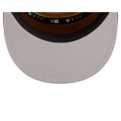 The Cleveland Cavaliers 2025 Tip-Off Split Panel 9FIFTY Snapback features an embroidered Cavaliers logo at the front panels against a pinstripe jersey fabrication with the NBA Logoman at the right-wear side. Additional details include an adjustable snapback closure at the rear and a gray undervisor.