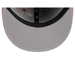 The Cleveland Guardians Diamond Hero Edition 59FIFTY Fitted Cap features an embroidered Guardians onomatopoeia pop logo at the front panels with baseball comic book prints at the front and back panel. Additional details include the MLB Batterman logo at the rear and a gray undervisor.