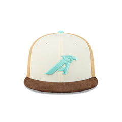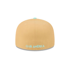 The Club América Tan 59FIFTY Fitted Cap features an embroidered América logo at the front panels with a matching team wordmark at the rear and a color block crown. Additional details include a brown corduroy visor with a blue undervisor.