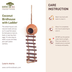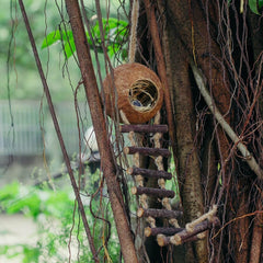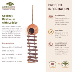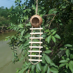HANDCRAFTED AND ECO-FRIENDLY: This Hanging Coconut Birdhouse with Ladder is skillfully handmade from reclaimed coconut shells by artisans in Vietnam. Each birdhouse highlights the natural texture and tone of the coconut, giving it a rustic and authentic charm.