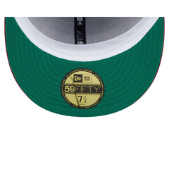 The Colorado Avalanche Spring Satin 59FIFTY Fitted Cap features an embroidered Avalanche wordmark at the front panels with a New Era pin at the top left panel and an NHL Shield logo at the rear. Additional details include a satin fabrication throughout, a logo at the right-wear side, and a green undervisor.