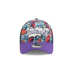 The Colorado Rockies Diamond Hero Edition 9FORTY A-Frame Snapback features an embroidered Rockies onomatopoeia pop wordmark at the front panels with baseball comic book prints at the front and back panel. Additional details include a ZOOM! wordmark at the left-wear side, the MLB Batterman logo above a snapback closure at the rear, and a black undervisor.
