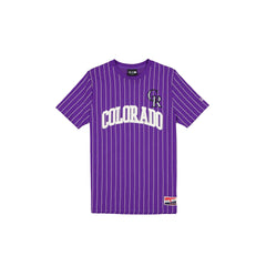 The Colorado Rockies Throwback Pinstripe Wordmark T-Shirt features a twill applique Rockies wordmark and logo at the front with a New Era jock tag at the left hip.