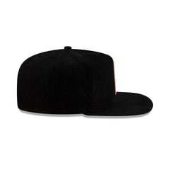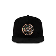 The Columbus Clingstones Black Corduroy Golfer features an embroidered Clingstones logo at the front panels against a corduroy fabrication. Additional details include a snapback closure at the rear and a green undervisor.