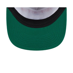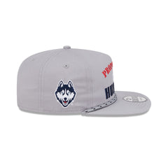 The Connecticut Huskies Vintage Gray Golfer features an embroidered 'PROPERTY OF' Huskies wordmark at the front panels with a team logo at the right-wear side and a rope at the visor. Additional details include a snapback closure at the rear and a green undervisor.