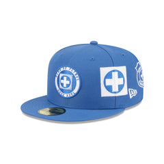 The Cruz Azul Indigo 59FIFTY Fitted Cap features the Cruz Azul primary logo embroidered at the front panels with alternate team logos throughout the crown, a team wordmark at the rear, and a gray undervisor.