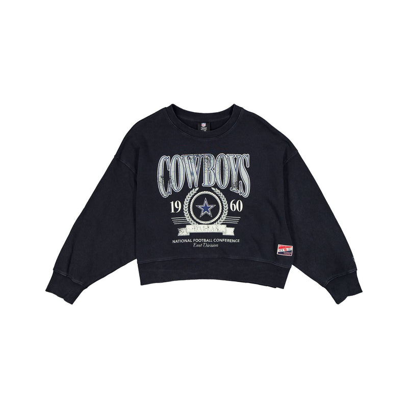 The Dallas Cowboys Throwback Women's Crewneck features a screen-printed Cowboys graphic at the front and a New Era jock tag at the left hip.