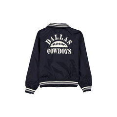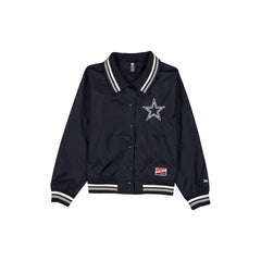The Dallas Cowboys Throwback Women's Jacket features an embroidered Cowboys logo at the left chest with a screen-printed wordmark at the rear. Additional details include front pockets, a button closure, and a New Era jock tag at the left hip.