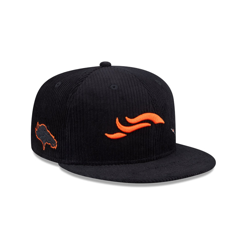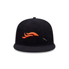The Denver Broncos Color Pop Cord 59FIFTY Fitted Cap features an embroidered Broncos logo at the front panels against a black corduroy fabrication throughout and a matching NFL Shield at the rear. Additional details include a black logo at the right-wear side and an orange undervisor.