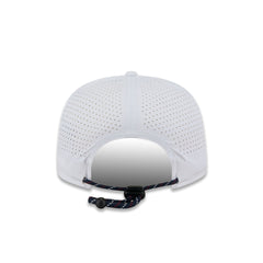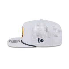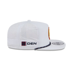 The Denver Nuggets Optic White Performance Rope Golfer features an embroidered Nuggets logo at the front panels with breathable performance fabric throughout the cap. Additional details include a city patch at the right-wear side, an adjustable drawstring closure at the rear, and a blue undervisor.