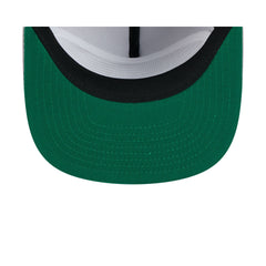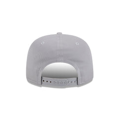 The Denver Nuggets Vintage Gray Golfer features an embroidered 'PROPERTY OF' Nuggets wordmark at the front panels with a team logo at the right-wear side and a rope at the visor. Additional details include a snapback closure at the rear and a green undervisor.