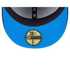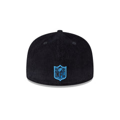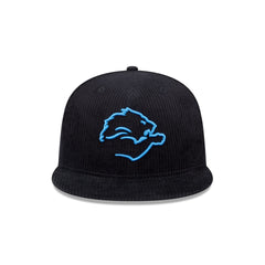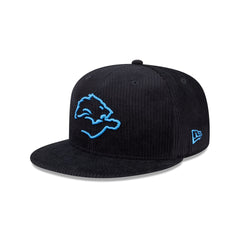 The Detroit Lions Color Pop Cord 59FIFTY Fitted Cap features an embroidered Lions logo at the front panels against a black corduroy fabrication throughout and a matching NFL Shield at the rear. Additional details include a black logo at the right-wear side and a blue undervisor.