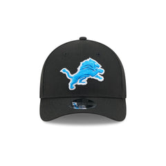 The Detroit Lions Team Black 9FORTY M-Crown Snapback features an embroidered Lions logo at the front panels with a matching NFL Shield logo above an adjustable snapback closure at the rear and a gray undervisor.