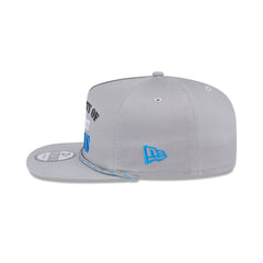 The Detroit Lions Vintage Gray Golfer features an embroidered 'PROPERTY OF' Lions wordmark at the front panels with a team logo at the right-wear side and a rope at the visor. Additional details include a snapback closure at the rear and a green undervisor.