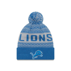 The Detroit Lions Wintry Kids Pom Knit features an embroidered Lions logo at the front with a team wordmark around the crown and a one-time removable pom.