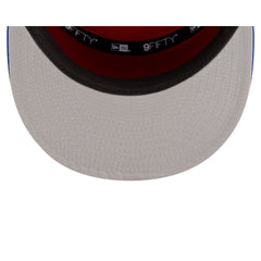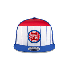 The Detroit Pistons 2025 Tip-Off Split Panel 9FIFTY Snapback features an embroidered Pistons logo at the front panels against a pinstripe jersey fabrication with the NBA Logoman at the right-wear side. Additional details include an adjustable snapback closure at the rear and a gray undervisor.