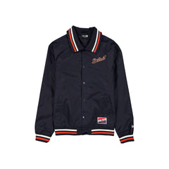 The Detroit Tigers Throwback Jacket features an embroidered Tigers logo at the left chest with a logo and wordmark at the rear. Additional details include pockets, a button closure, and a New Era jock tag at the left hip.