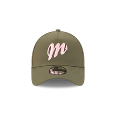 The Diablos Rojos del México Olive 9FORTY A-Frame Snapback features an embroidered Diablos Rojos logo at the front with a snapback closure at the rear and a gray undervisor.