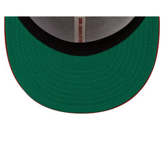 The El Águila de Veracruz Retro 59FIFTY Fitted Cap features an embroidered El Águila retro logo at the front panels with a 100th Anniversary LMB logo at the rear and a green undervisor.