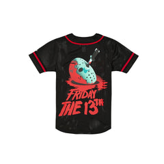 The Friday the 13th Jersey features a screen-printed Friday the 13th mask above a number 13 at the left chest with a Friday the 13th wordmark at the right chest. Additional details include a button up closure at the front with red lined seams and a Friday the 13th graphic at the rear.