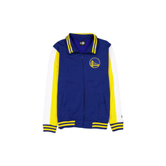 The Golden State Warriors Game Day Jacket features an embroidered Warriors logo at the left chest and graphic at the back. Additional details include pockets and a zipper closure.