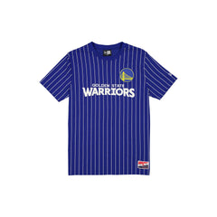 The Golden State Warriors Throwback Pinstripe Wordmark T-Shirt features a twill applique Warriors wordmark and logo at the front with a New Era jock tag at the left hip.