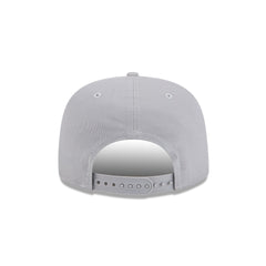 The Green Bay Packers Vintage Gray Golfer features an embroidered 'PROPERTY OF' Packers wordmark at the front panels with a team logo at the right-wear side and a rope at the visor. Additional details include a snapback closure at the rear and a green undervisor.