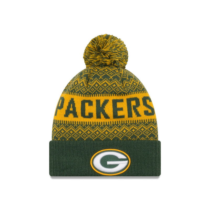 The Green Bay Packers Wintry Kids Pom Knit features an embroidered Packers logo at the front with a team wordmark around the crown and a one-time removable pom.