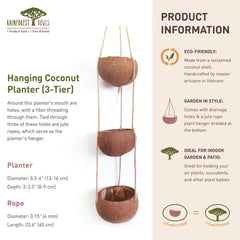 Add a natural, organic touch to your home or garden with this 3-tier hanging coconut shell planter, handcrafted from reclaimed coconut shells. Each tier is carefully shaped and polished to highlight its unique texture and tone. The planter features three stacked bowls connected by natural rope and includes a drainage hole to support healthy plant growth.