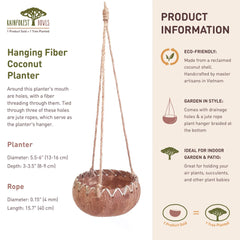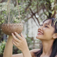 Add a natural touch to your space with this hanging coconut fiber planter, handcrafted from reclaimed coconut shells. Each piece is individually carved and finished to highlight the natural texture and warm tone of the shell. Ideal for displaying succulents, orchids, herbs, and small indoor or outdoor plants, it brings sustainable charm to your garden, balcony, or home decor.