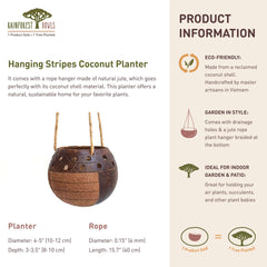 HAND-CARVED FROM NATURAL COCONUT SHELLS: This Hanging Striped Coconut Planter with Drainage Hole is carefully handcrafted from reclaimed coconut shells by skilled Vietnamese artisans. The striped carved texture adds depth and character, making each planter a one-of-a-kind decorative piece for your plants.