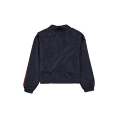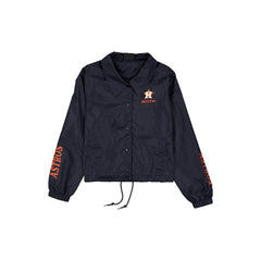 The Houston Astros Game Day Women's Jacket features a screen-printed Astros logo at the left chest with a wordmark at each sleeve. Additional details include a button closure, pockets, and adjustable drawstrings at the waist.