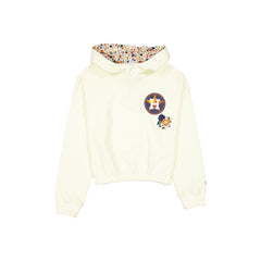 The Houston Astros Glam Game Women's Hoodie features a screen-printed Astros logo at the left chest with matching embroidered flowers. Additional details include a zipper closure and a floral lining.