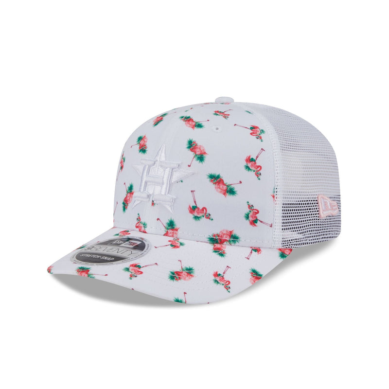 The Houston Astros Pattern 9SEVENTY Trucker Hat features an allover flamingo print with an embroidered Astros logo at the front panels with an adjustable snapback closure at a mesh rear.