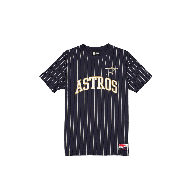 The Houston Astros Throwback Pinstripe Wordmark T-Shirt features a twill applique Astros wordmark and Cooperstown logo at the front with a New Era jock tag at the left hip.