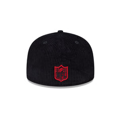The Houston Texans Color Pop Cord 59FIFTY Fitted Cap features an embroidered Texans logo at the front panels against a black corduroy fabrication throughout and a matching NFL Shield at the rear. Additional details include a black logo at the right-wear side and a red undervisor.