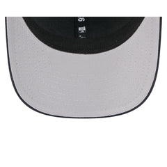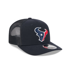 The Houston Texans Team 9SEVENTY Trucker features an embroidered Texans logo at the front panels with a matching NFL Shield logo above an adjustable snapback closure at a mesh rear and a gray undervisor.