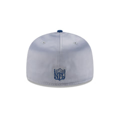 The Indianapolis Colts Bold Satin 59FIFTY Fitted Cap features an embroidered satin Colts Historic graphic at the front panels with a satin fabrication throughout. Additional details include a matching NFL Shield logo at the rear and a gray undervisor.