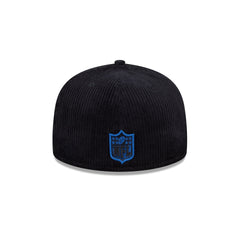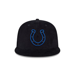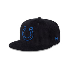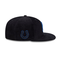 The Indianapolis Colts Color Pop Cord 59FIFTY Fitted Cap features an embroidered Colts logo at the front panels against a black corduroy fabrication throughout and a matching NFL Shield at the rear. Additional details include a black logo at the right-wear side and a blue undervisor.