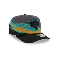 The Jacksonville Jaguars Brushstroke Golfer features an embroidered black Jaguars logo at the front panels against a team color brushstroke. Additional details include a snapback closure at the rear and a gray undervisor.