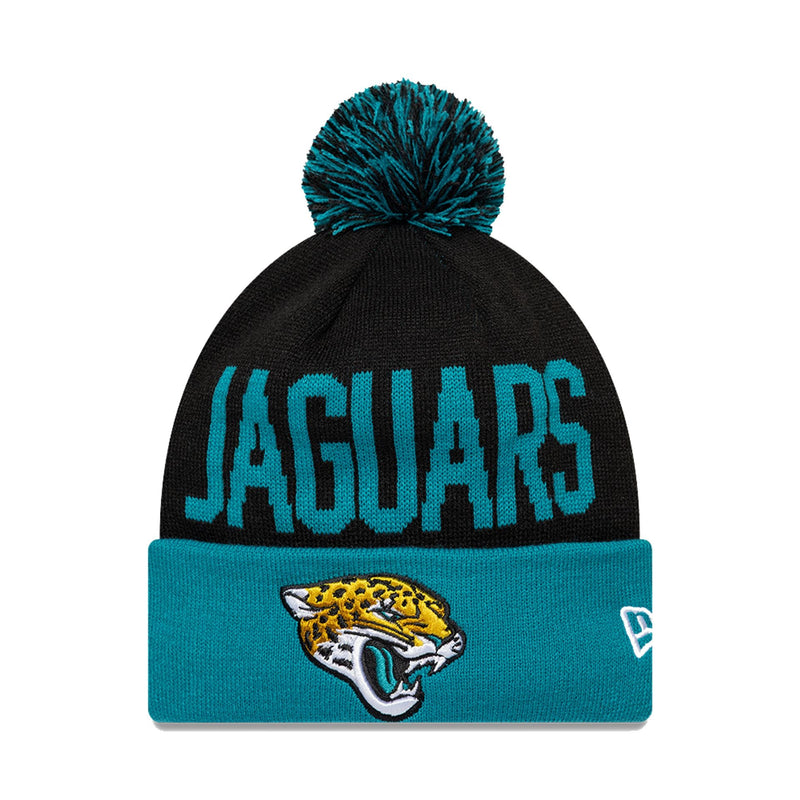 The Jacksonville Jaguars London Game Team Pom Knit features an embroidered Jaguars logo at the front cuff with a London Game patch at the rear and a one-time removable pom.