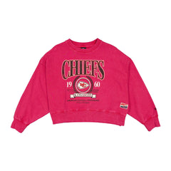 The Kansas City Chiefs Throwback Women's Crewneck features a screen-printed Chiefs graphic at the front and a New Era jock tag at the left hip.