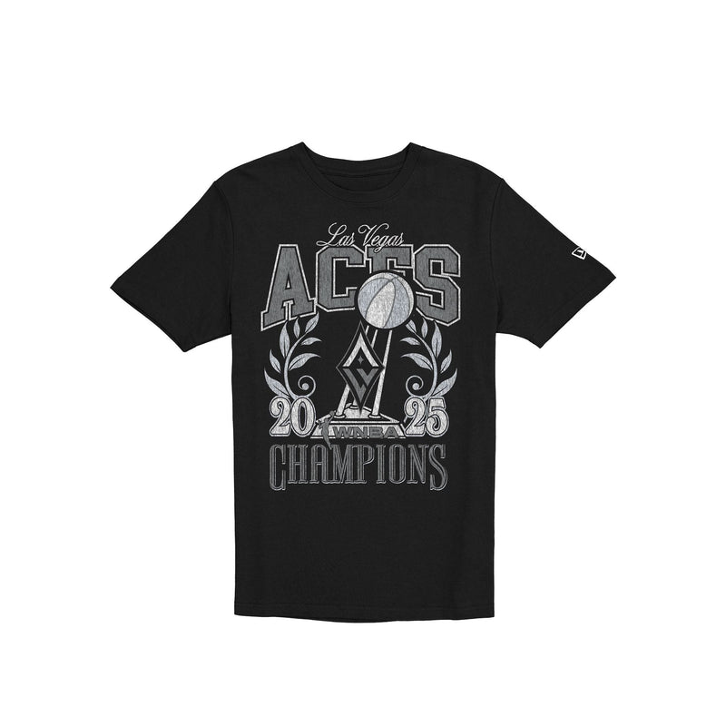 The Las Vegas Aces 2025 Champions T-Shirt features a screen-printed Aces 2025 WNBA Champions graphic at the front.