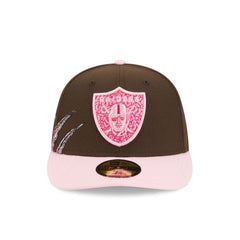 The Las Vegas Raiders Brains 59FIFTY Fitted Cap features an embroidered brain themed Raiders logo at the front panels with a matching NFL Shield at the rear. Additional details include scratch details at the right-wear side with a light pink visor and a gray undervisor. This cap comes with a pre-curved visor.