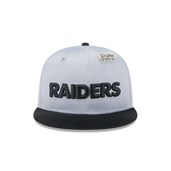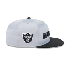 The Las Vegas Raiders Spring Satin 59FIFTY Fitted Cap features an embroidered Raiders wordmark at the front panels with a New Era pin at the top left panel and an NFL Shield logo at the rear. Additional details include a satin fabrication throughout, a logo at the right-wear side, and a green undervisor.