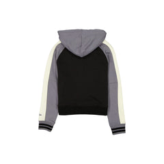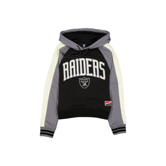 The Las Vegas Raiders Throwback Women's Hoodie features a twill applique Raiders wordmark above an embroidered team logo at the front. Additional details include adjustable drawstrings at the hood and a New Era jock tag at the left hip.