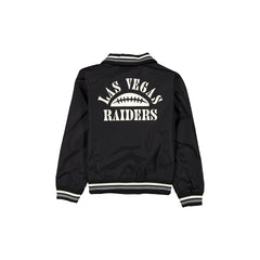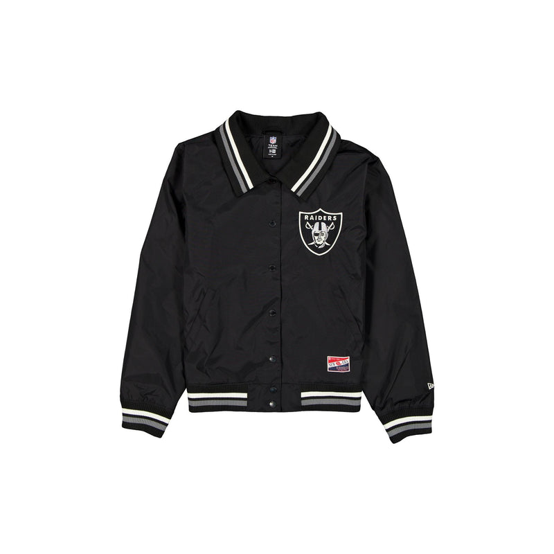 The Las Vegas Raiders Throwback Women's Jacket features an embroidered Raiders logo at the left chest with a screen-printed wordmark at the rear. Additional details include front pockets, a button closure, and a New Era jock tag at the left hip.