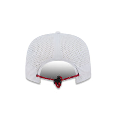 The Los Angeles Angels Optic White Performance Rope Golfer features an embroidered Angels logo at the front panels with breathable performance fabric throughout the cap. Additional details include a city patch at the right-wear side, an adjustable drawstring closure at the rear, and a red undervisor.